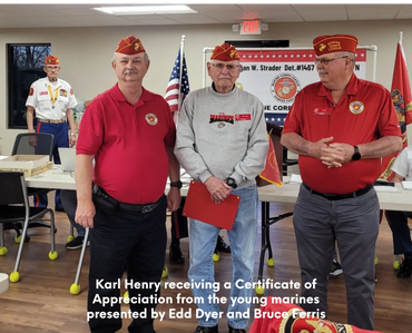 I just want to say thank you to the members of the Marine Corps League who attended the medal ceremony today down at Memorial Park. Your men and women made a very big impression on the family as well as Congressman Rose. Without the support of your Marines today there would have been very few people there to celebrate this important moment for the Baize family. I spoke with Mrs. Baize after the ceremony and she was so impressed and pleased by the turnout of your members.